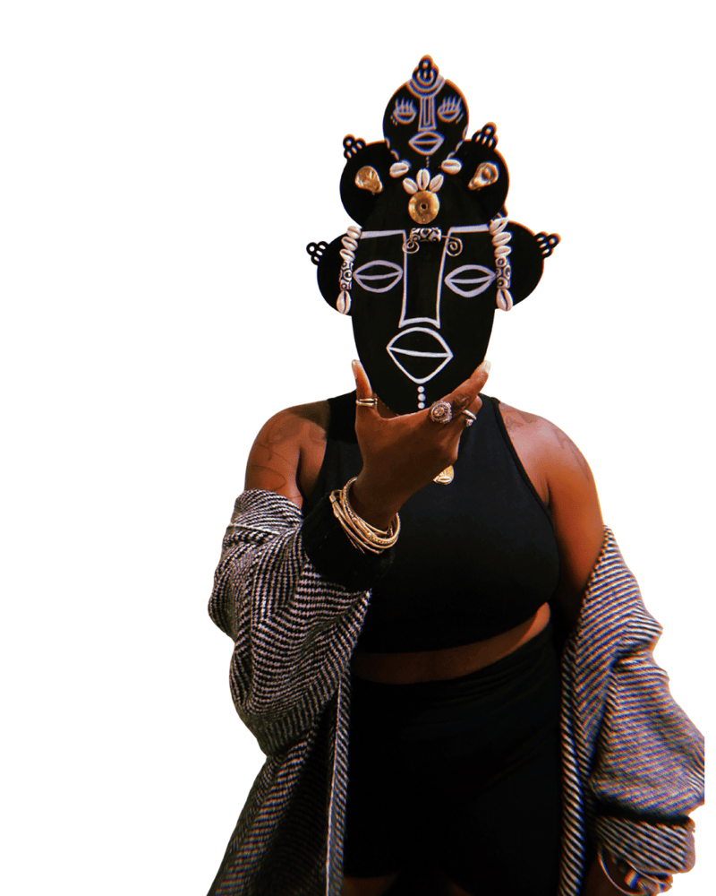 Handmade One-of-a-kind wooden mask, painted in acrylic and adorned with mixed media embellishments including cowrie shells, ceramic beads, vintage African trade beads, and brass.